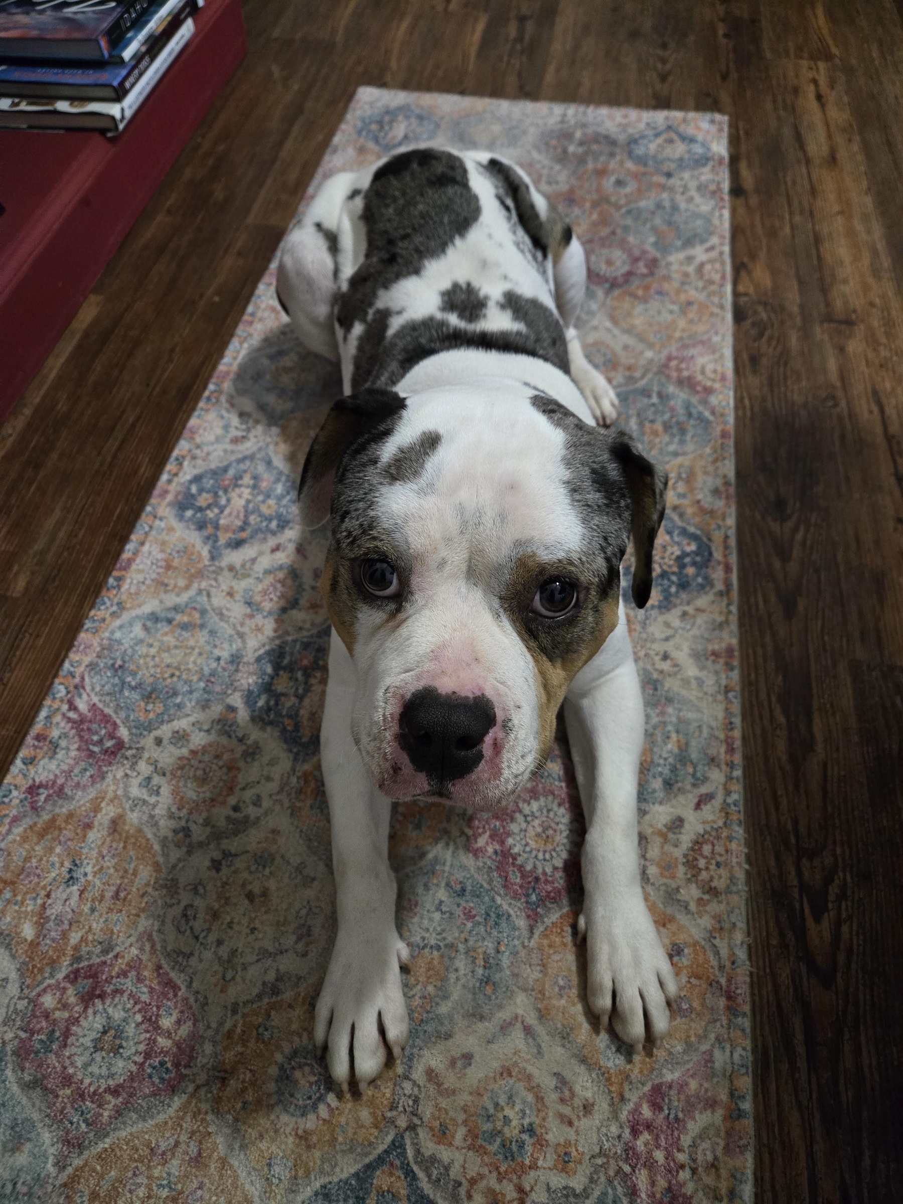 Rex is a sweet young boy who loves playing and bouncing around outside, but he calms down nicely for pets and snuggles in the house. He has the sweetest face and a unique speckled coat. Rex responds quickly to training, knows a few commands and he is eager to learn more things. He has good manners, is house-trained and eats/sleeps in his crate. He loves playing with other dogs and "listens" to the older dogs in his foster home when they don't want to be bothered. He gets a little worried when his favorite person leaves the house, but he is easily re-directed with toys and positive feedback.