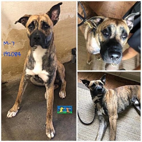We believe Boone to be a Black Mouth Cur Mix. His estimated DOB is 7/2018, and he weighs 52.5 pounds as of 7/13/19.