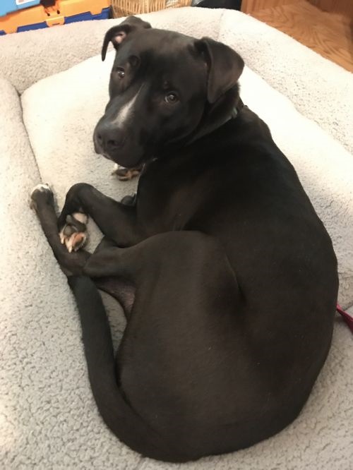 We believe KORALINE to be a Lab Retriever/Terrier mix. Her estimated DOB is 4/6/2019, and she weighs 58pounds as of 4/06/20