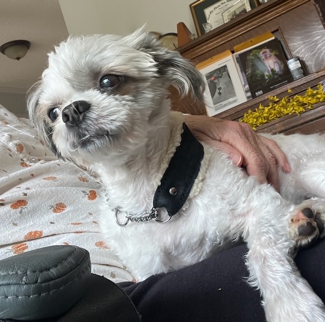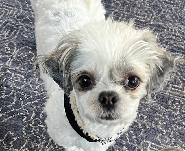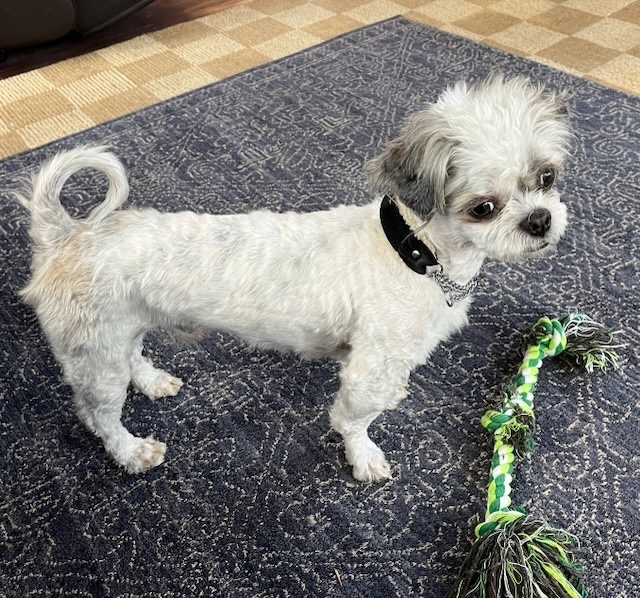 He’s a 10-pound professional cuddler, happiest curled up in your lap, but also perfectly content to perch nearby on a fluffy blanket like a tiny, scruffy prince surveying his kingdom. And that smile? Pure sunshine. He is SUCH a joyful, feel-good little dog.